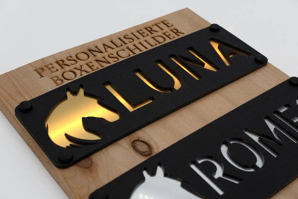 Jedes Schild wird individuell nach deinen Wünschen gefertigt: mit Pferdenamen, Stalllogo oder eigenem Design. Dank hochwertiger Materialien und präziser Lasergravur sind unsere Schilder witterungsbeständig, langlebig und pflegeleicht – ideal für den täglichen Einsatz im Stall.