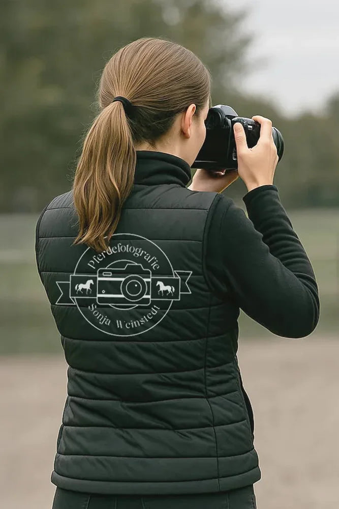 Die Weste wird für Branchen wie Reitlehrer, Pferdephysiotherapeuten, Hufschmiede und Tierärzte veredelt und personalisiert. Firmenlogo, Name und Schriftzug sind als Werbeaufdruck möglich.